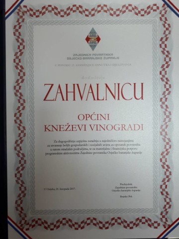 Svečanoj konferenciji nazočio je i načelnik Općine Kneževi Vinogradi Vedran Kramarić, kojemu je u ime Općine Kneževi Vinogradi uručena zahvalnica za dugogodišnju uspješnu suradnju u zajedničkim nastojanjima za stvaranje boljih gospodarskih i socijalnih uvjeta za opstanak povratnika u ratom stradalim područjima, te za materijalnu i financijsku potporu programskim aktivnostima Zajednice povratnika Osječko-baranjske županije.