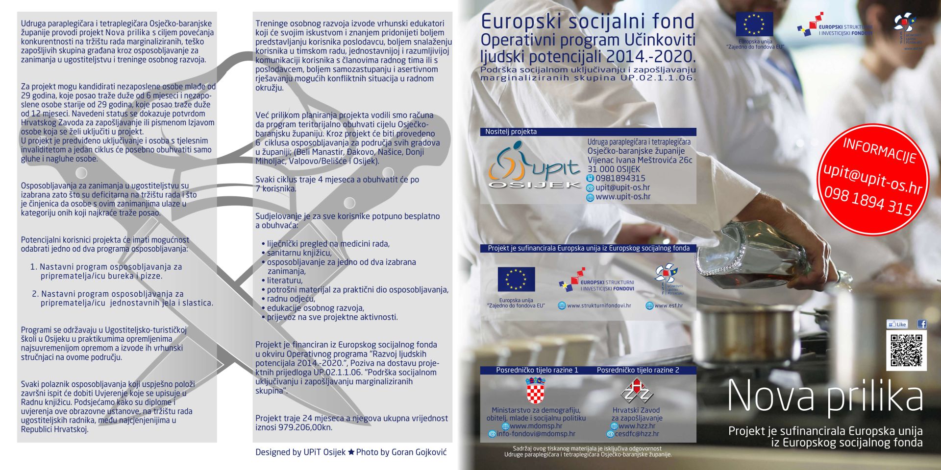 Udruga paraplegičara i tetraplegičara Osječko-baranjske županije je korisnik bespovratnih sredstava Europske unije iz Europskog socijalnog fonda u okviru Operativnog programa učinkoviti ljudski potencijali 2014.–2020., Podrška socijalnom uključivanju i zapošljavanju marginaliziranih skupina, za financiranje projekta Nova prilika UP.02.1.1.06.0019. čiji je cilj osposobljavanje marginaliziranih nezaposlenih skupina građana za zanimanja u ugostiteljstvu.