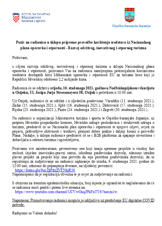 S ciljem razvoja održivog, inovativnog i otpornog turizma u sklopu Nacionalnog plana oporavka i otpornosti, Ministarstvo turizma i sporta poziva sve dionike iz sektora turizma na radionicu namijenjenu potencijalnim korisnicima sredstava dostupnih kroz Mehanizam oporavka i otpornosti EU za turizam kroz koji je Republici Hrvatskoj odobreno 2,2 milijarde kuna.