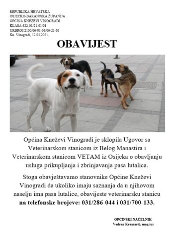 Općina Kneževi Vinogradi je sklopila Ugovor sa Veterinarskom stanicom iz Belog Manastira i Veterinarskom stanicom VETAM iz Osijeka o obavljanju usluga prikupljanja i zbrinjavanja pasa lutalica.