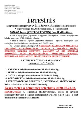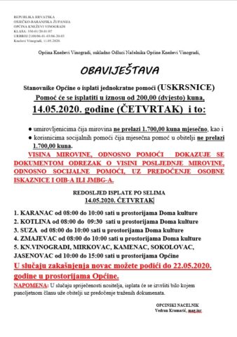 Općina Kneževi Vinogradi, sukladno Odluci Načelnika Općine Kneževi Vinogradi, obavještava stanovnike Općine o isplati jednokratne pomoći (USKRSNICE).  Pomoć će se isplatiti u iznosu od 200,00 (dvjesto) kuna, 14.05.2020. godine (ČETVRTAK)  i to: