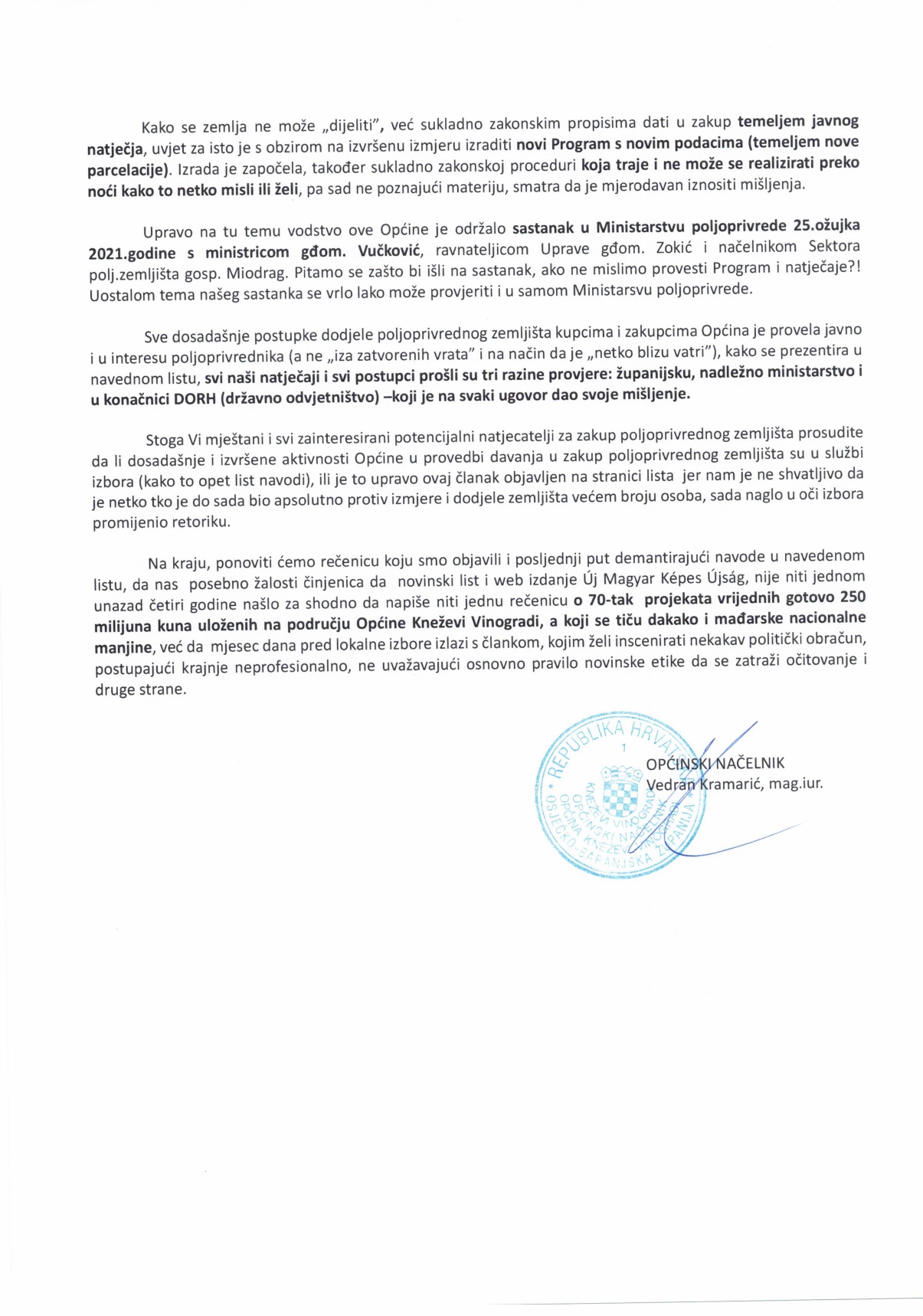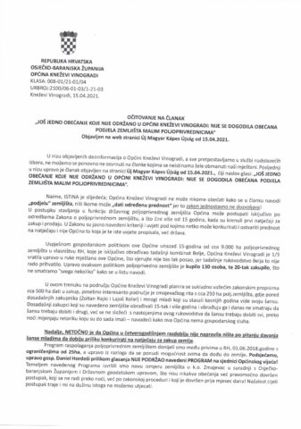 Očitovanje na članak: ˝Mještani Suze i Zmajevca: „ U strahu smo od ljetnih pljuskova”˝ objavljen na web stranici Új Magyar Képes Újság, te FB stranici Baranjamedija dana 22. travnja 2021. godine